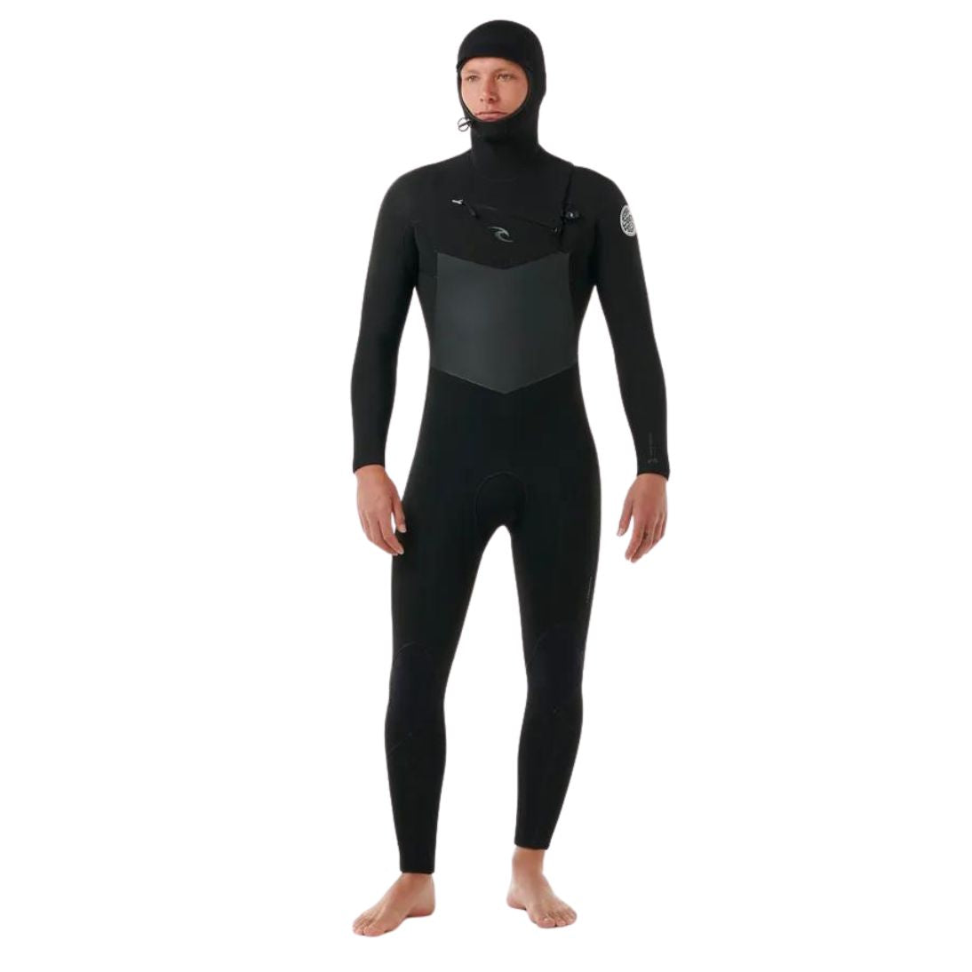A male model wearing a Rip Curl Dawn Patrol 5/4mm black mens hooded wetsuit with a chest zip feature and yulex rubber inside out. View of the front