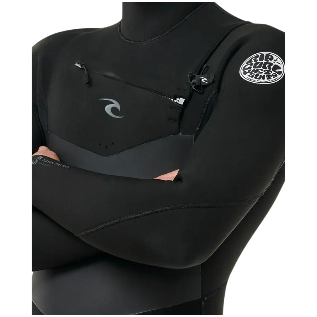 A male model wearing a Rip Curl Dawn Patrol 5/4mm black mens hooded wetsuit with a chest zip feature and yulex rubber. Close up view of the chest zip entry